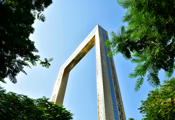 ドバイフレームは、黄金に輝く巨大な額縁型の建造物で、高さ約150mを誇ります。