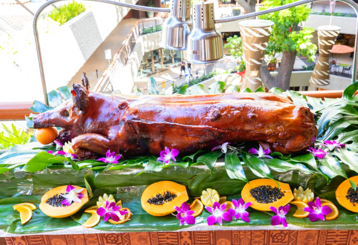 ルアウ・ビュッフェでは、丸ごと豚のローストやプライムローストビーフを楽しみながら、ウクレレの生演奏やフラショー、フラレッスンでハワイの音楽と踊りに触れることができます。